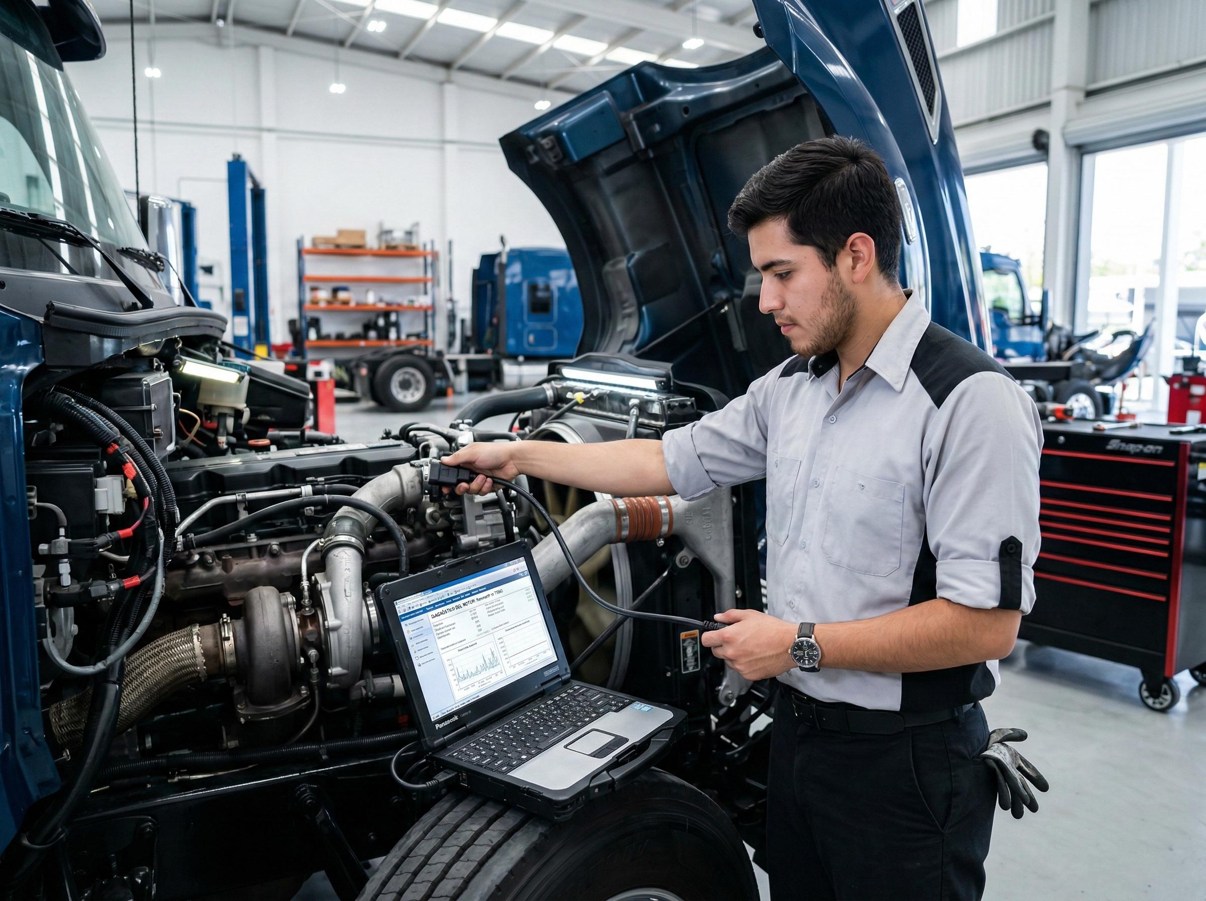 Nuestra gestión integral abarca todos los aspectos físicos y técnicos de tus unidades. Realizamos mantenimiento preventivo y correctivo especializado en maquinaria pesada y tractocamiones (modelos Diésel y CNG). Lo que nos distingue es nuestra capacidad de diagnóstico avanzado: ejecutamos evaluaciones dinámicas en ruta con carga representativa, analizando a detalle el consumo real de combustible y AdBlue.